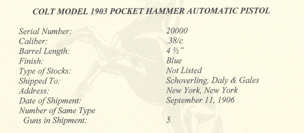 Model 1903 Pocket Hammer .38 ACP serial number 20000 - Pistol features high polished blued finish with fire blued small parts. This pistol was manufactured on September 8, 1906 and shipped September 11, 1906 to Schoverling, Daly & Gales in New York City. There were 5 guns in the shipment. The Colt Model 1903 Pocket Hammer .38 ACP is one of the more interesting early Colt semi-automatic variations for Colt collectors due to Colt's method of assigning serial numbers for this model. Beginning in 1903, the first gun manufactured for commercial shipment was number 19999 and the numbering continued in descending order (19999, 19998, 19997...) until serial number 16000 which was manufactured in 1906.